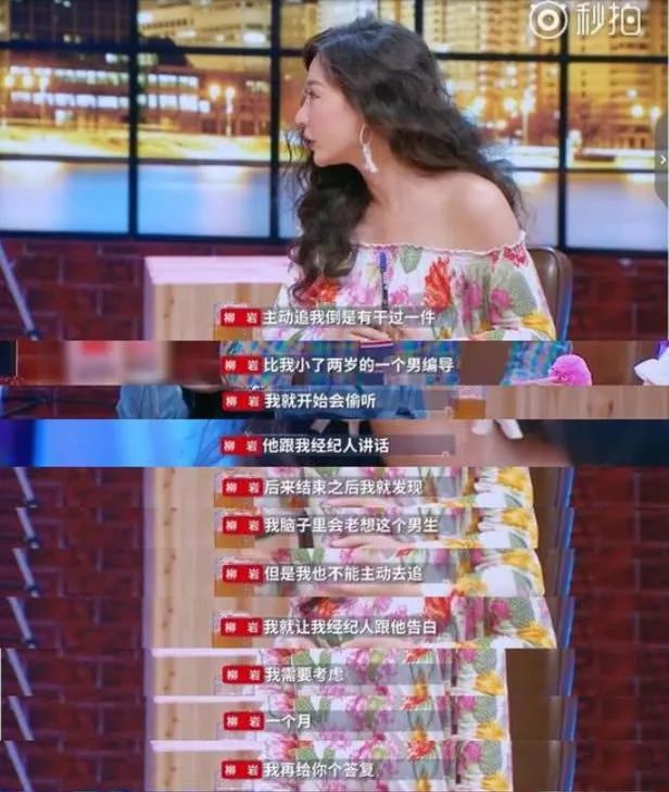 她表示自己当初喜欢上了一个小自己两岁的编导,长得特别帅气,自己会特别注意他,偷听他说话,有没有女朋友等,而且时不时就会想起他。不过她并没有自己去告白,而是让自己的经纪人去帮自己向他告白。