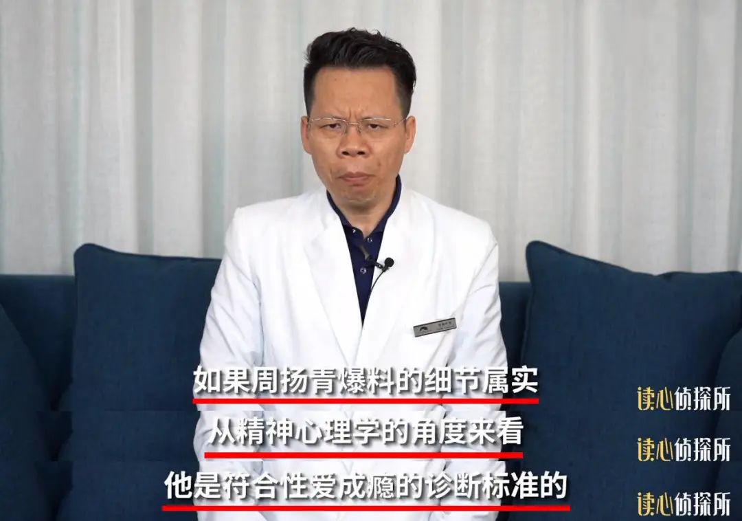 精神心理专家何日辉从精神心理学角度给出了一个答案:“如果周扬青爆料细节属实,艺人罗志祥可能患有'性爱成瘾'。”