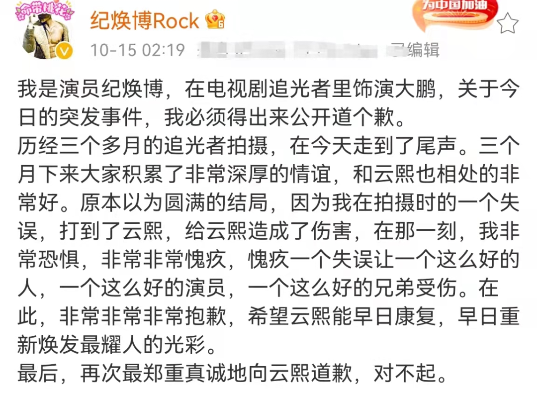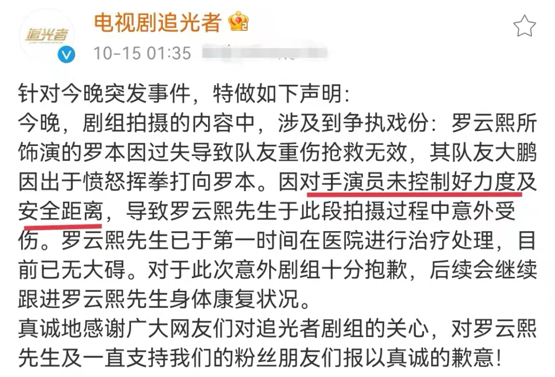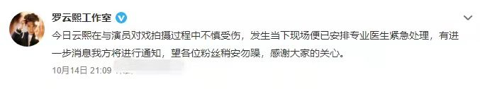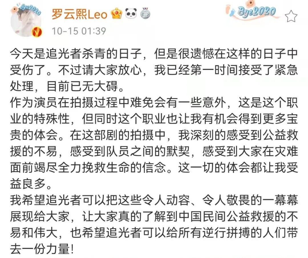 15日凌晨1:35,官博解释罗云熙受伤的原因,再次道歉。