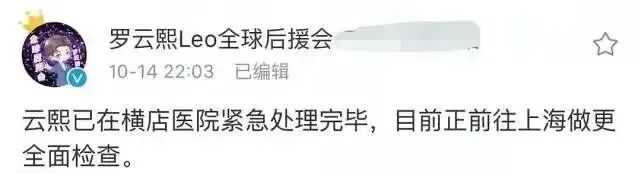 十点,粉丝后援会确认在横店医院紧急处理,并转到上海作进一步全面检查。