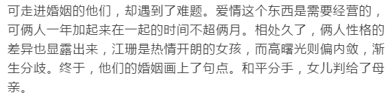 离婚的消息传开,引起了一阵轩然大波。不断有传言说某一方出轨或和别人暧昧不清,他们都在第一时间替对方澄清。高曙光说:“江珊是个很棒的女人,请大家别再用各种猜测去伤害她了。”即使不再是夫妻,他们依然维护着对方,“分手之后,我们把曾经相爱变成了美好记忆。”