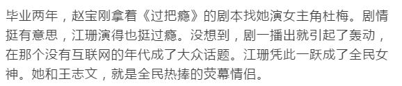 因为唱了《过把瘾》的主题曲。江珊的音乐才能被发掘,签了唱片公司,出了音乐专辑。别说,她还真的是有天分。那时,大街小巷都在放她的《梦里水乡》。她拿了很多歌手奖,歌还入围了当年的“十大金曲”。