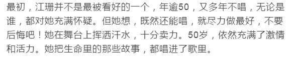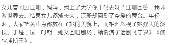 江珊这一路走来,不以大红大紫为成就,也不以回归平凡为落寞。她只是每个阶段,都坚持做着自己。无论岁月如何更变,她仍保初心。这个走过时光却容颜未改的女人,在人生路上漫漫前行,坚定而美丽。