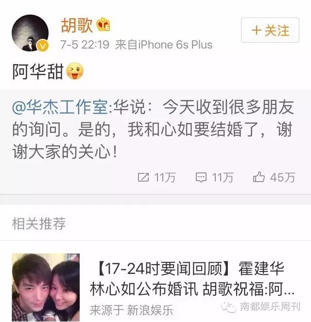 霍建华与林心如昨日下午宣布结婚后,网友都炸成一团。从恋情宣布后胡歌一直处于不回应的状态,成为了网友们调侃的话题,5日晚间胡歌终于在微博发声为这对新人送上祝福:“阿华甜。”(意指霍建华很甜。)