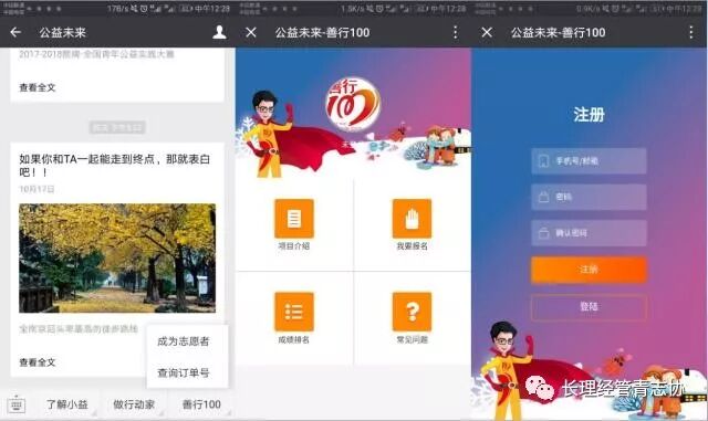 微信关注“公益未来”公众号完成善行100志愿者报名