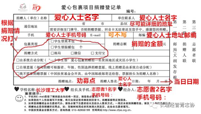为爱心人士填写三联单时,需要字迹清晰。同时和爱心人士说明尽量将地址写详细清晰,以免出现回音卡、捐赠凭据无法收到的情况。