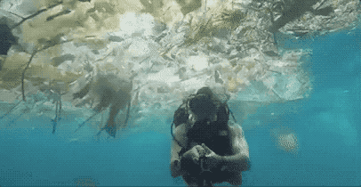 大量的塑料袋、竹竿、盆、瓶子漂浮在海洋中,甚至淹没了鱼类的生存环境,夺取了本该属于海底生物的自由。