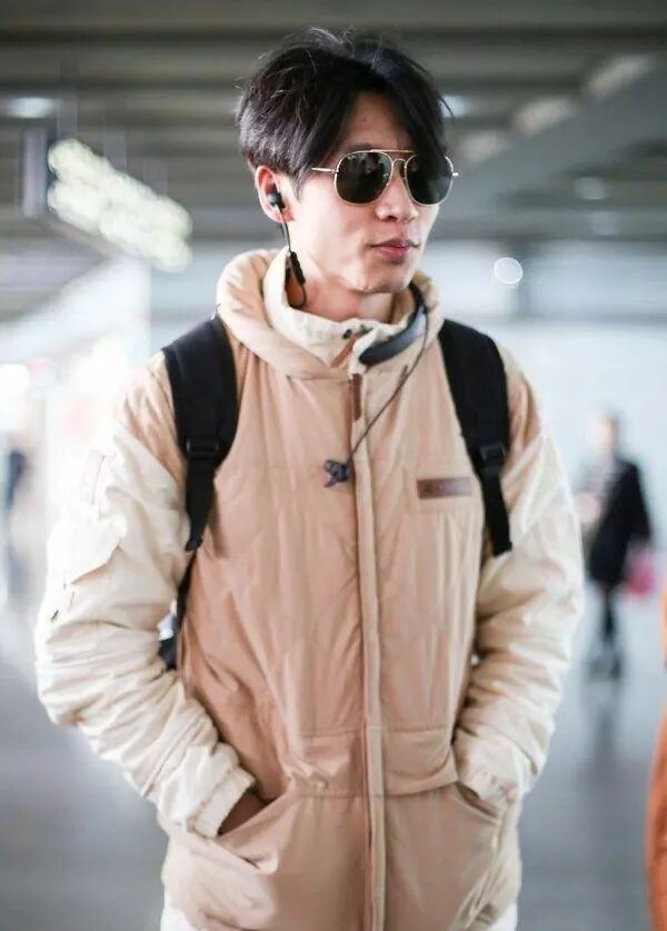 背着黑色的双肩包,双手插在口袋的样子一副乖巧的样子,黑色墨镜挡住了脸,头发有些凌乱,脸上还有点胡子渣。