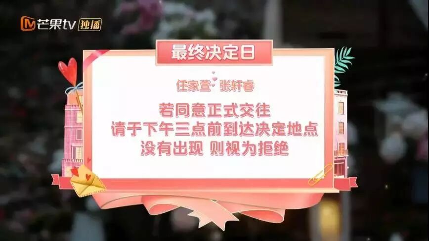 收官这期的大致剧情是这样的,任家萱和张轩睿迎来了“最终决定日”,如果同意正式交往,就在第二天下午三点到达指定地点,没有出现的话就视为拒绝。