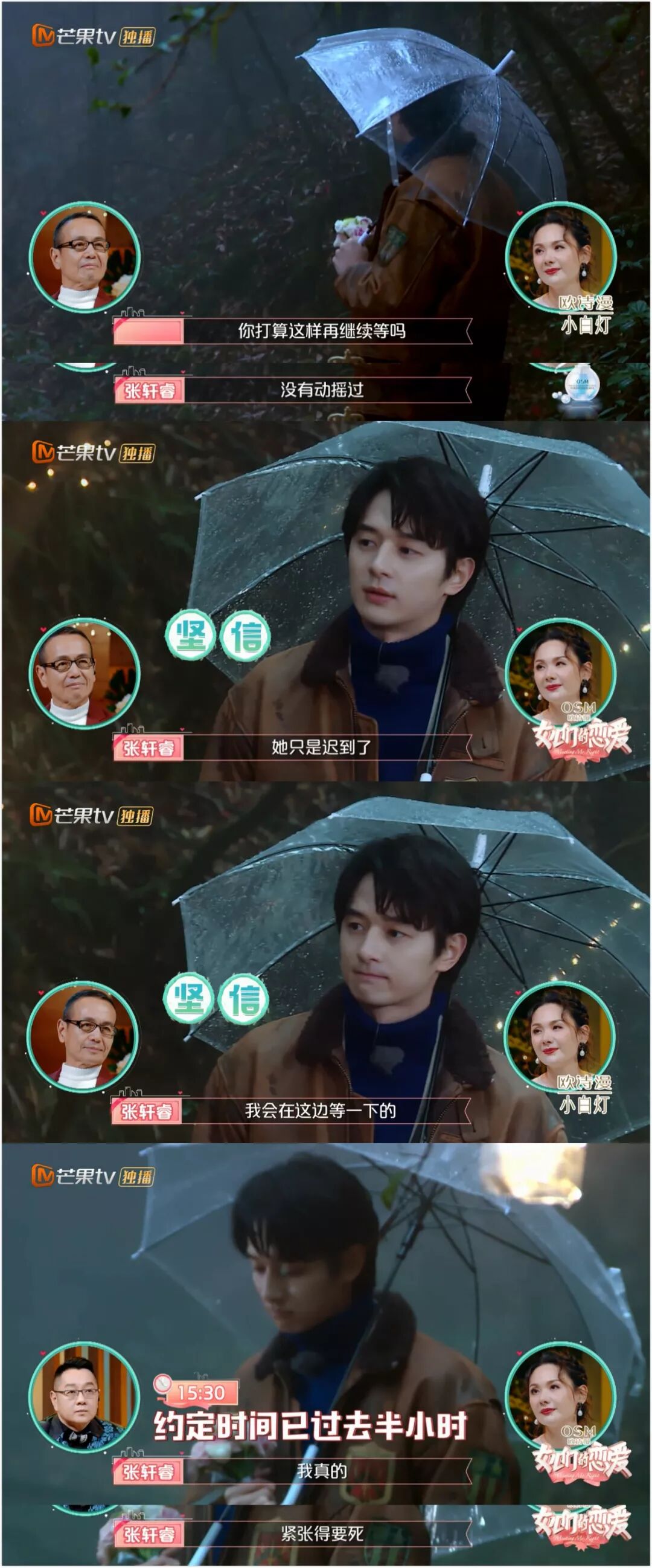 第二天约定时间过了之后,任家萱没出现,张轩睿就在雨中静静等待,看起来很不安。