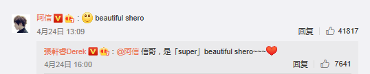 阿信也在评论区发来祝福,张轩睿也回应了 ↓↓