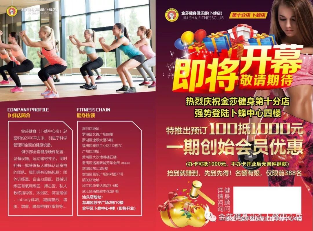 金莎健身连锁 (卜蜂中心店) 创始会员招募预存100抵1000元即将结束!