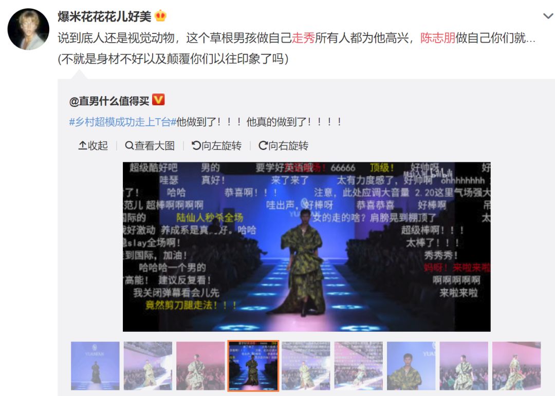 可到了陈志朋这里,大家似乎把所有的负面情绪都扔在了他脸上,吐槽妆容、恨天高、短裤、肚腩...