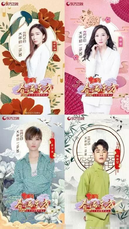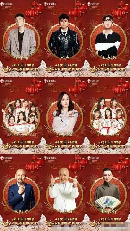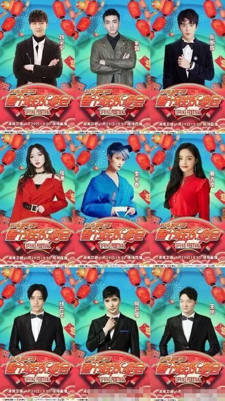 东方卫视春晚:李宇春、王俊凯、王源、易烊千玺、刘昊然、阿米尔汗、费玉清、张云雷、周笔畅、尚雯婕、娄艺潇、韩雪、黄景瑜、魏大勋等。