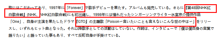 1998年先是和一直崇拜的音乐家冰室京介合作了一首《one》,接着演唱了自己主演的日剧《麻辣教师》的主题曲《Poison》,一瞬间走上音乐巅峰,这首歌也随着电视剧一起成为无数少男少女青春的回忆。
