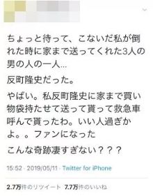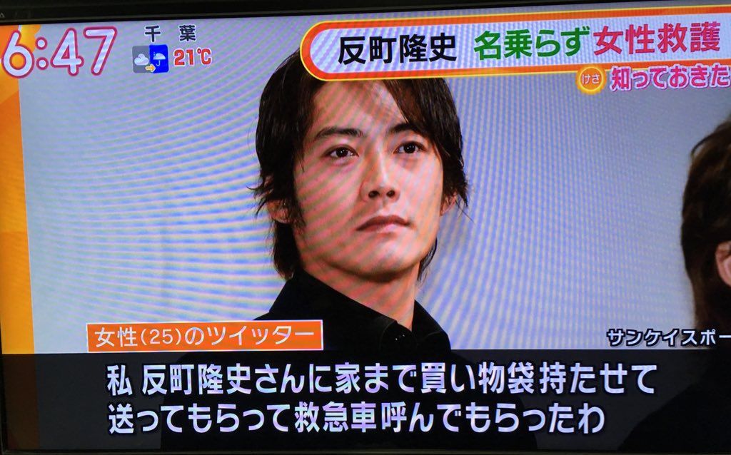 事后该女子在推特写到:原来当天送我的三人中有一人是反町隆史啊。帮我叫了救护车,还帮忙把我的购物袋拿回家,最重要的是没告诉我他是反町隆史,做好事不留名,真是个好人呢。被他圈粉了!简直就是奇迹啊!不好意思忘记加敬语了,非常感谢反町隆史和他的朋友,以及最初伸出援手的上班族!!!