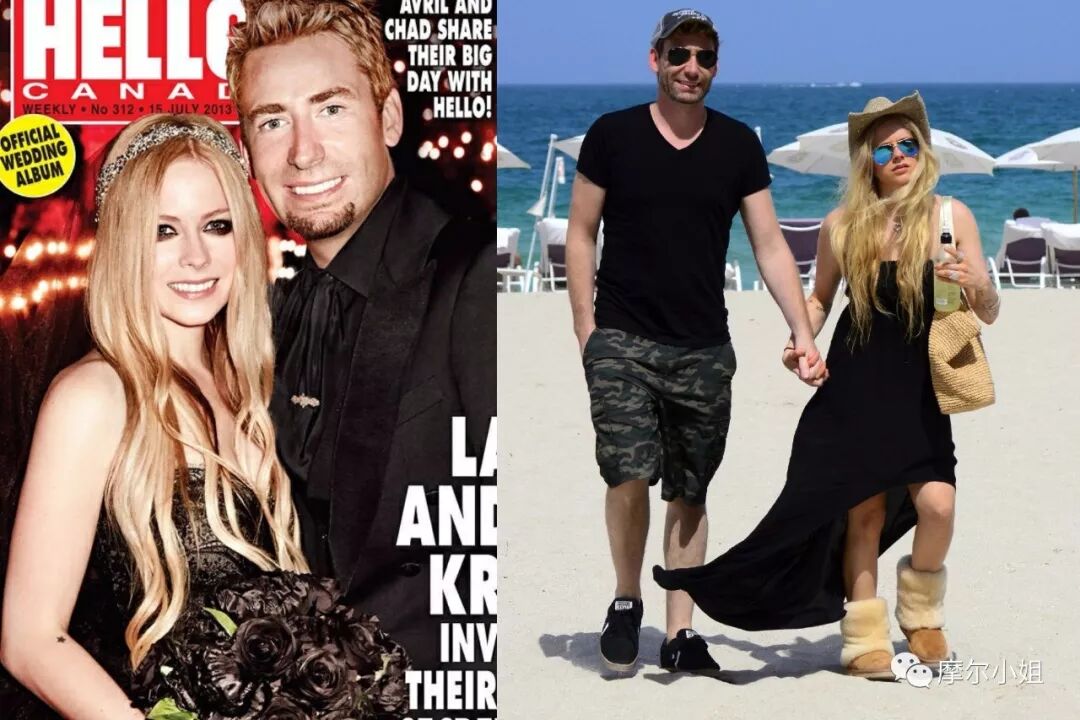除了在音乐探索上经历的坎坷之外,她的情路也是颇为艰辛。她的第一任老公是她17岁相识,19岁恋爱,21岁就成婚的Sum 41乐队主音兼吉他手德里克·惠布利。很可惜这段婚姻只维持了三年多。