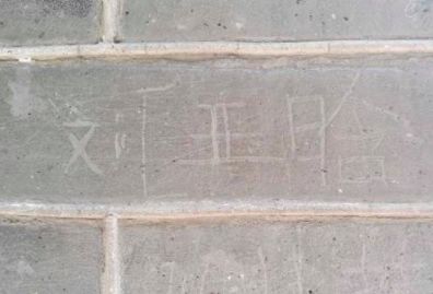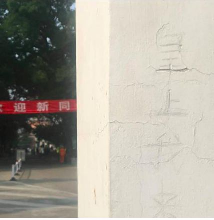 清华另一标志性建筑“二校门”门框也曾被人用硬物刻字:皇上我来了。此外,在另一侧相应的位置,还有相似笔迹的刻字“大家辛苦了”,砖石基座上也被刻有多个名字。