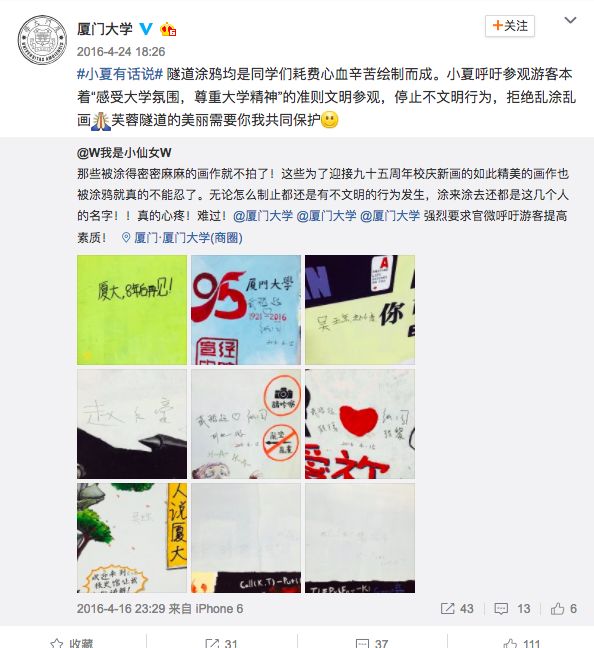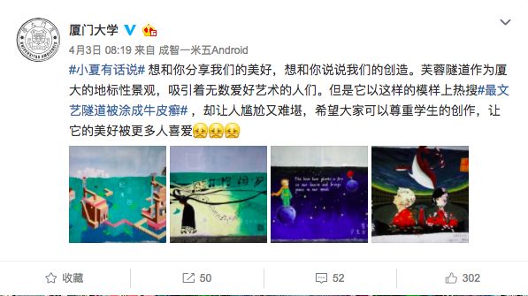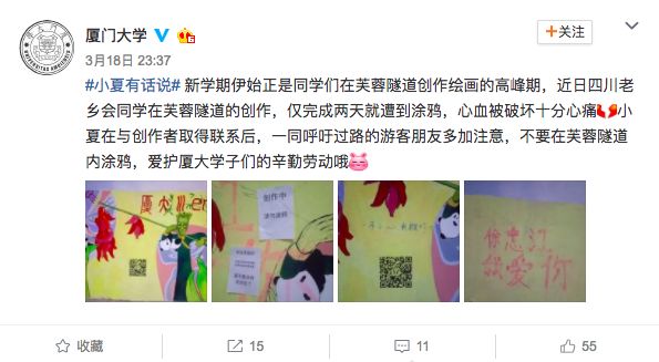 @厦门大学:“新学期伊始正是同学们在芙蓉隧道创作绘画的高峰期,近日四川老乡会同学在芙蓉隧道的创作,仅完成两天就遭到涂鸦,心血被破坏十分心痛