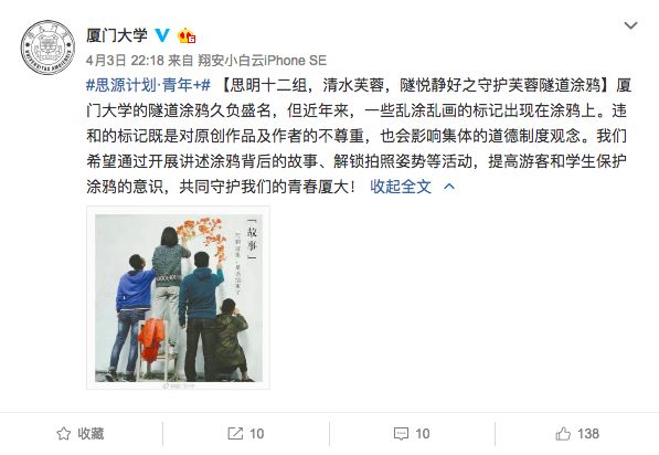 还是4月3日,晚上厦门大学又发布微博称,“我们希望通过开展讲述涂鸦背后的故事、解锁拍照姿势等活动,提高游客和学生保护涂鸦的意识,共同守护我们的青春厦大!”↓↓↓