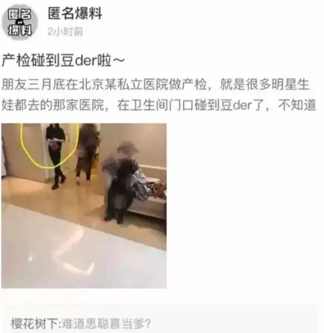 随后关八爆料,有网友曾目睹豆得儿出现在北京某私立医院疑似是在做产检,而且那个医院明星生孩子都爱去。