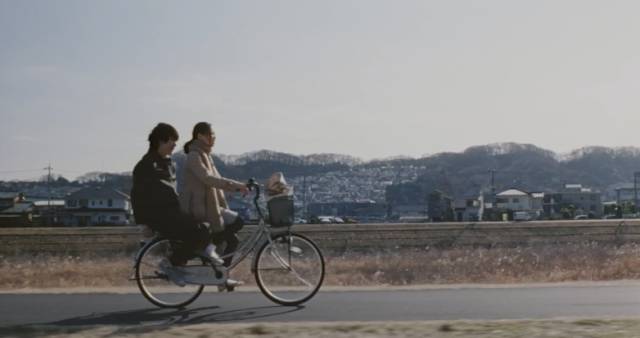清朗的上午,女人瘦小的身体骑车载着身高腿长的大男孩,