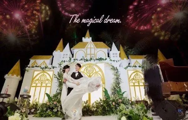 当时上热搜的时候,有很多婚礼的照片,这种塑料感极强的背景,感觉走进了并不太昂贵的影楼。