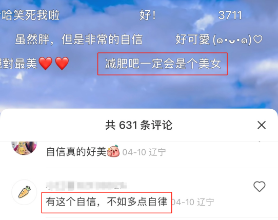 在她们的评论下,网友们一边鼓励自信最美,一边建议“加油瘦下30斤,就啥也不用烦了”。