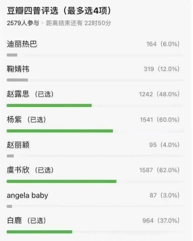 当时,杨紫、虞书欣、赵露思、白鹿高票当选前四名,成为口口相传的“内娱四大普女”。