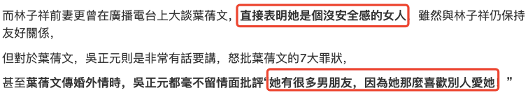可能是因为叶倩文和林子祥的孩子们关系太好了,前妻吴正元就出来说话了,她说叶倩文是个非常没有安全感的人。