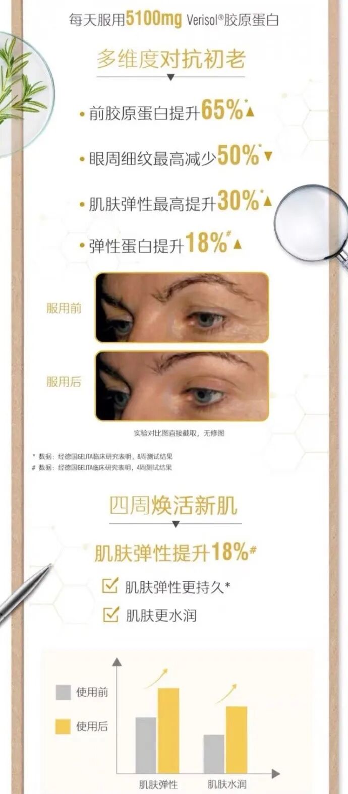 经临床验证,女性每天服用VERISOL®水解胶原蛋白,4周后,肌肤弹性最高能提升30%。