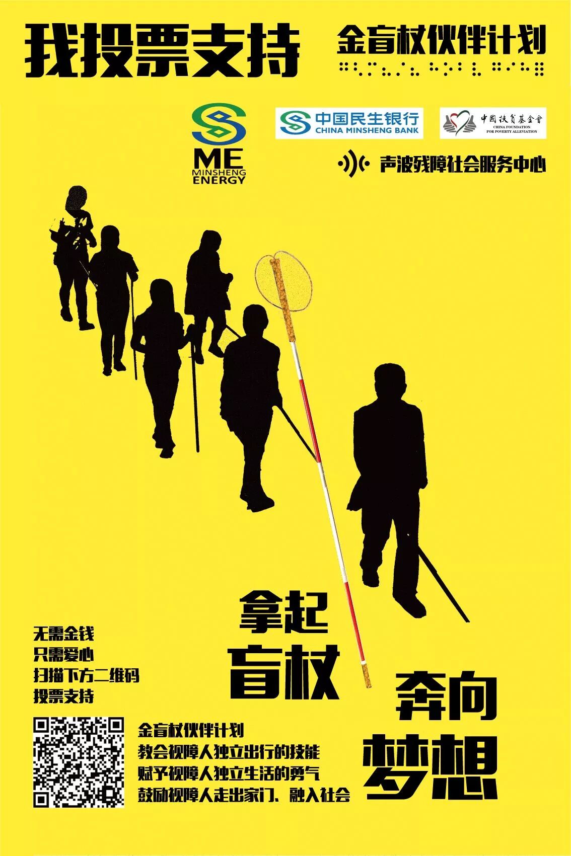 金盲杖伙伴计划,教会视障人独立出行的技能,赋予视障人独立生活的勇气,鼓励视障人走出家门,融入社会。更多详情,请参阅项目介绍页面。