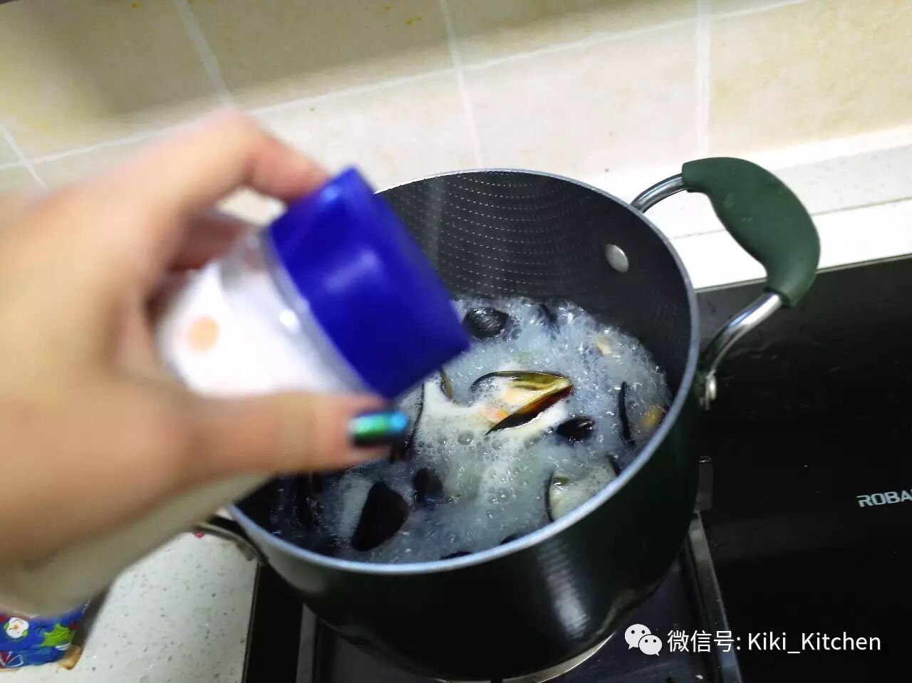 4/放一点点盐和黑胡椒。要注意,主页君买的这种青口贝本身是带调味的,如果你买的是原味青口贝,可以适当加一点其他的调味素