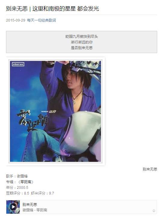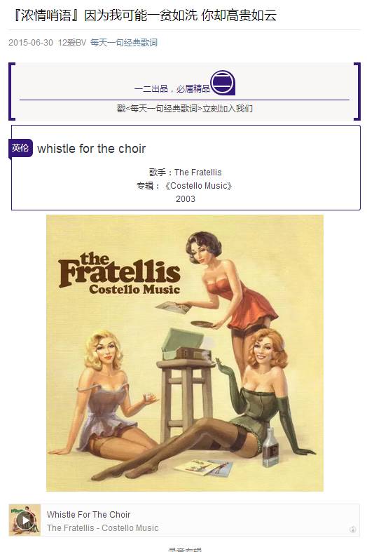 第二,方便老朋友对往期推送内容的检索,毕竟和常规的新闻段子类公众号不同,我更希望bvmusic能够成为一个像杂志一样可以随时回顾浏览的平台,而微信自带的历史记录功能还是比较鸡肋,人工更新推送目录就显得很有必要了~(留言回复所有内容里你最喜欢的歌吧~本期回复一律入选!一律入选!话说有人还记得自己是因为哪首歌关注bvmusic的嘛?)