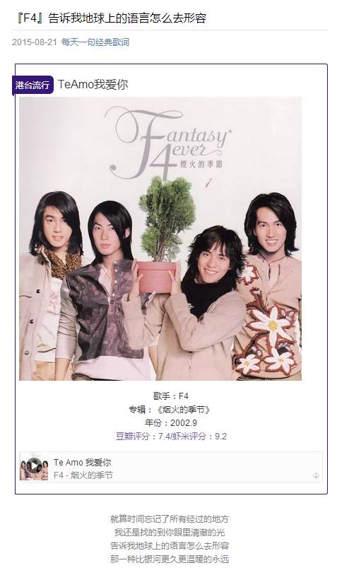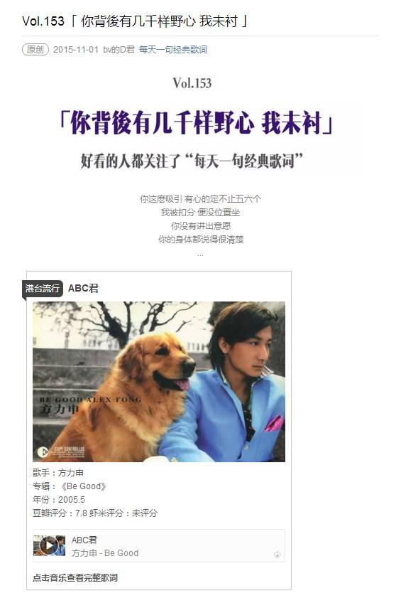 最后,方便自己对推送内容的回顾,每一期推送都有着关于那段时期的记忆,真正像bvmusic的简介中所说的,经典的不止是旋律,还有那个时代保存的心情。