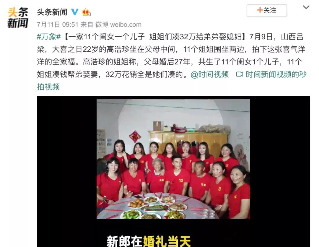 就说前几天的新闻吧,11个闺女1个儿子,11个姐姐凑32万给弟弟娶媳妇。