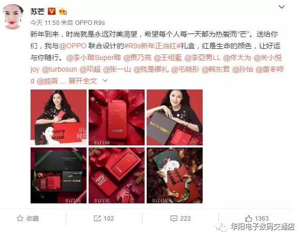时尚女王苏芒也为众多明星送上这款颜值爆表的OPPO R9s新年特别版:大热的红黑配色,黑色屏幕静默、深邃,红色外观则热情、高能。再加上时尚礼盒的衬托,更让OPPO R9s红色版有了无法抵挡的诱惑力。不少时尚达人明星们都high翻了,纷纷在微博里与粉丝们分享。从分享中,我们不难看出明星们对OPPO R9s新年特别版的喜爱。而微博的转发数与点赞数更可见粉丝对这款手机的喜爱。