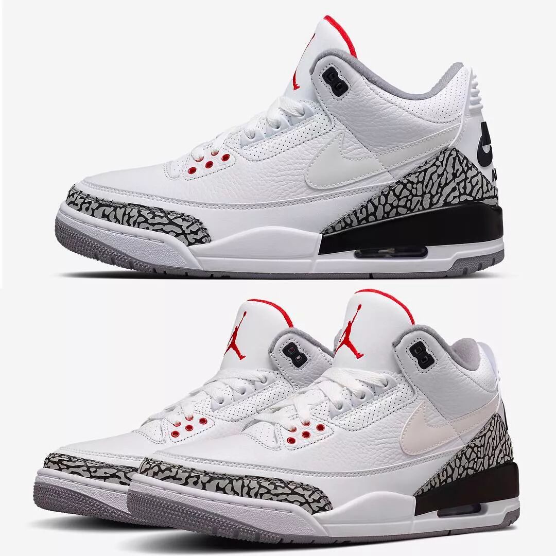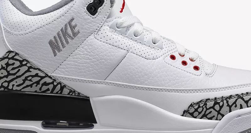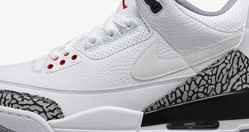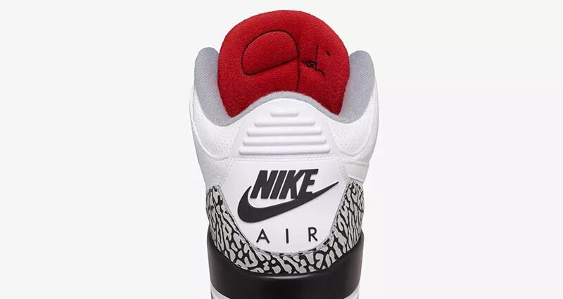 这双白水泥 Air Jordan 3 没有采用水晶外底,后跟以 Nike Air 标志呈现。值得注意的是,鞋身侧边居然带有 Swoosh 大钩标志!同即将要发售的 Tinker Hatfield 配色同出一辙。