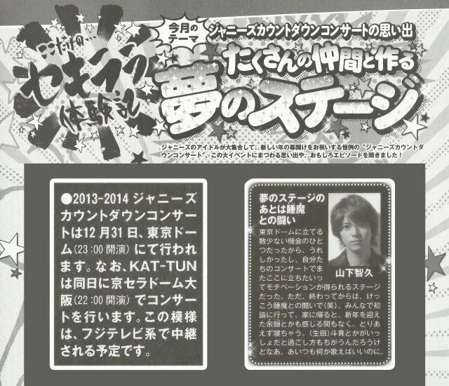 因为能站在东京巨蛋的机会很少,所以非常开心。这里是能够释放自己的舞台,我还想在这里举办这种热情的演唱会。只是,结束之后就开始和睡魔抗争(笑)。大家一起去了新年的初参拜,回家之后,虽然依然能够感受到迎接新年的气氛,可什么都不管了我先睡了。不过如果是和(生田)斗真一起的话,或许我就不会这样度过了吧。他也来唱两首就好了。