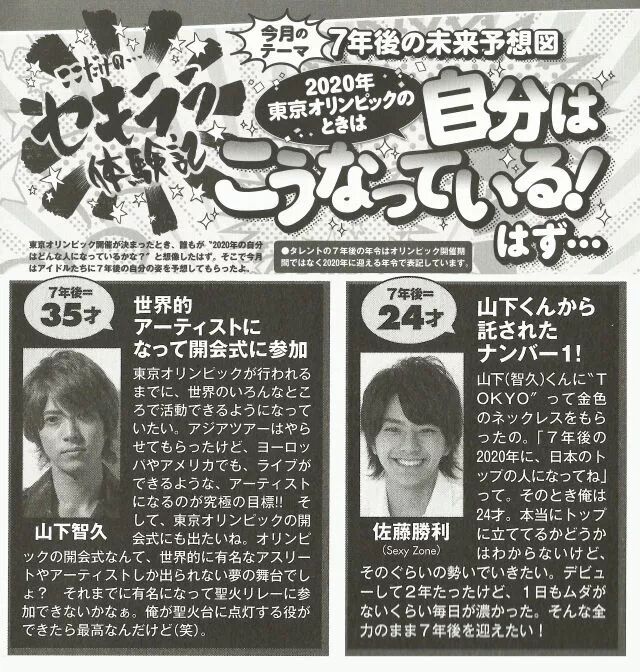 在东京奥运会开幕以前,想去世界各地参加活动。虽然举行了亚洲巡演,能在欧洲和美国进行演出成为艺人是我最终的目标!!然后,想在东京奥运会开幕式上表演。奥运会的开幕式,本就只有世界有名的艺人才能参加的吧?到了那时,变有名了的我能参加火炬传递吗。我要是能在圣火台点亮圣火就最好了(笑)。