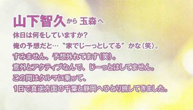 山下带去北海道的行李,是一个小型旅行包。还有笔记本电脑。本以为是为了要在房间里听音乐或看电影,然而却是要“公演结束后,要了DVD在房间里检查”。巡演中,虽然也吃了各地特产,但是“一边确认DVD,一边吃着饭店的room service”的情况比较多。这一次的巡演是迄今最大规模。虽然如此准备时间却很短。「一直到演出开始之前都反复彩排,有终于开始了啊的感觉。感觉这是到目前为止最累的一次。在各地的演出结束后,“那个地方,这样做会更好吧”之类的,一个一个的想法不断冒出来。有种巡演的同时自己也可以更加精益求精的感觉。」就像旅行的经验会让人成长一样,感觉自己的演出也在成长。