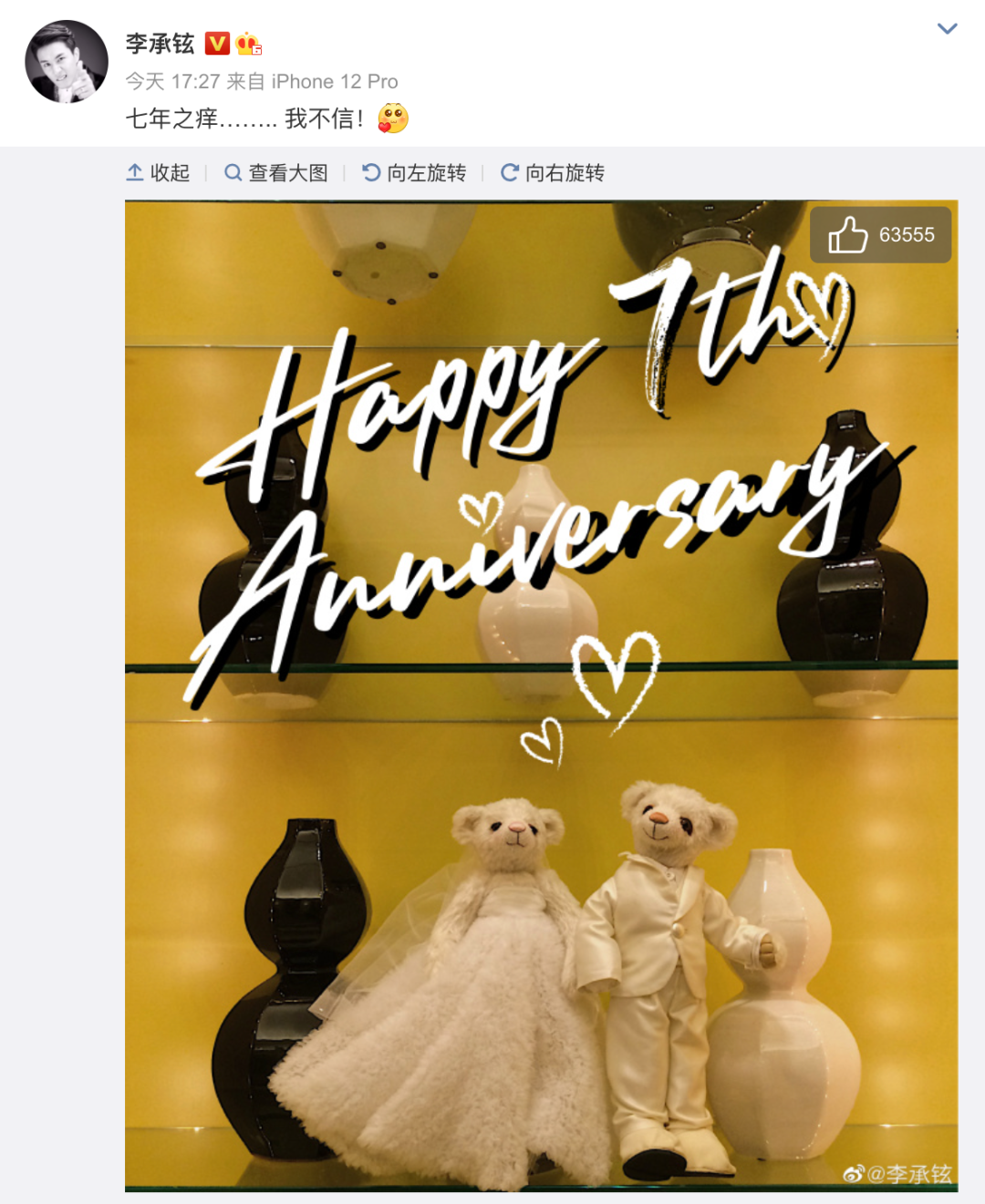 李承铉发微博庆祝并写道:“七年之痒......我不信!”