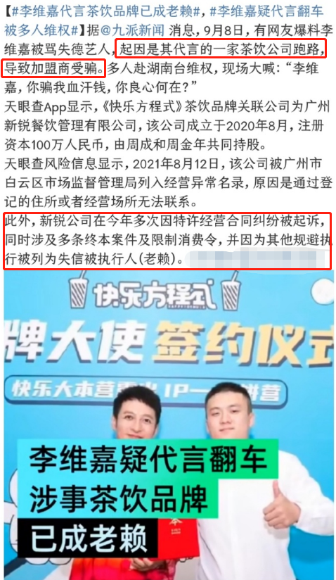 随着事情发酵,大家才知道,原来是维嘉曾经代言的一家茶饮品牌出事了~