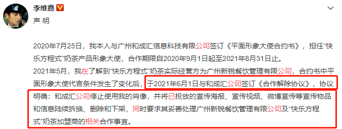 得知此事后,维嘉很快给予回应,称自己已于6月1日解除相关合约。