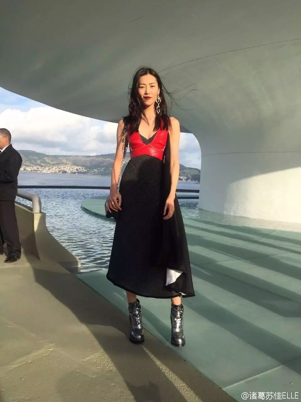 蒋欣通过穿衣服能一秒间在胖子和瘦子间来回穿梭,比如这种流线型的无袖连衣裙,刚好暴露了她胳膊粗的缺点,不过全身装扮还是很知性的。