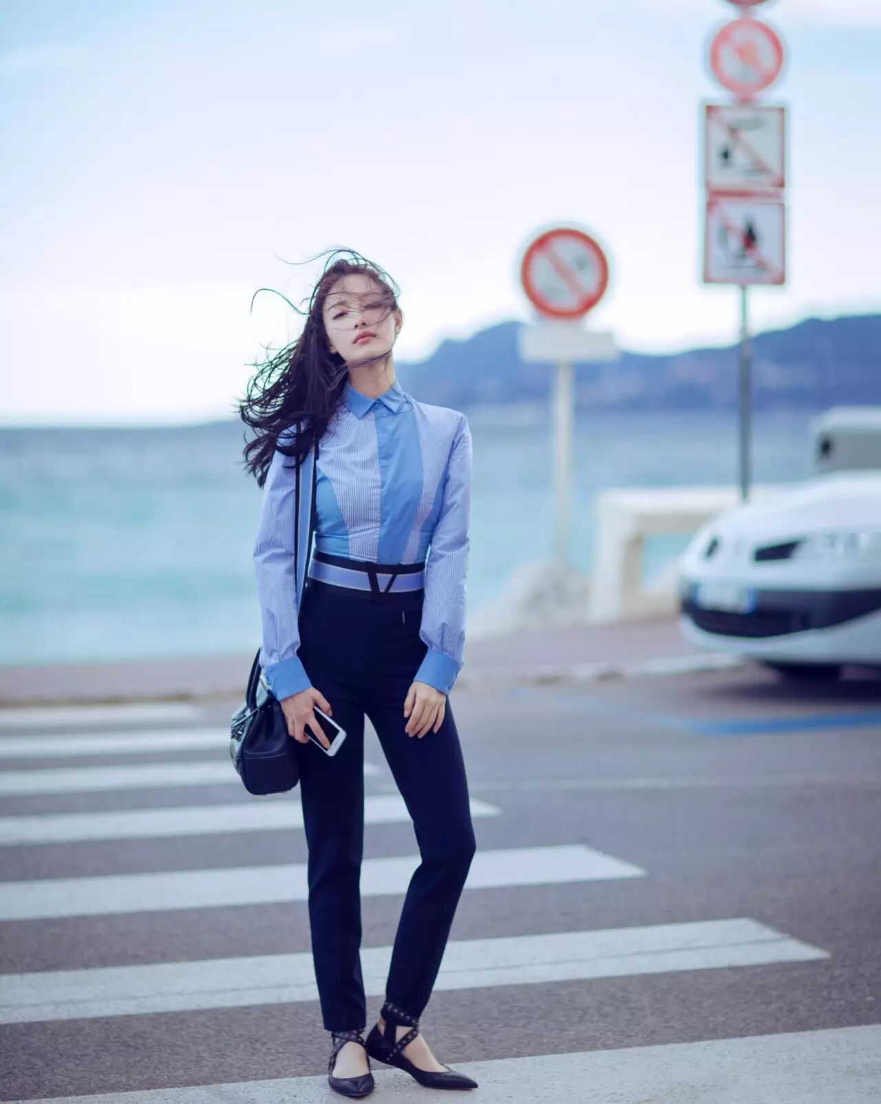 修身衬衣搭配高腰裤,加上倪妮本来的大长腿,腿长得美死人。