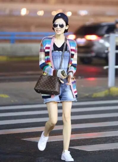 很俏皮的背带短裤,但娜扎的腿实在瘦得有点吓人了。