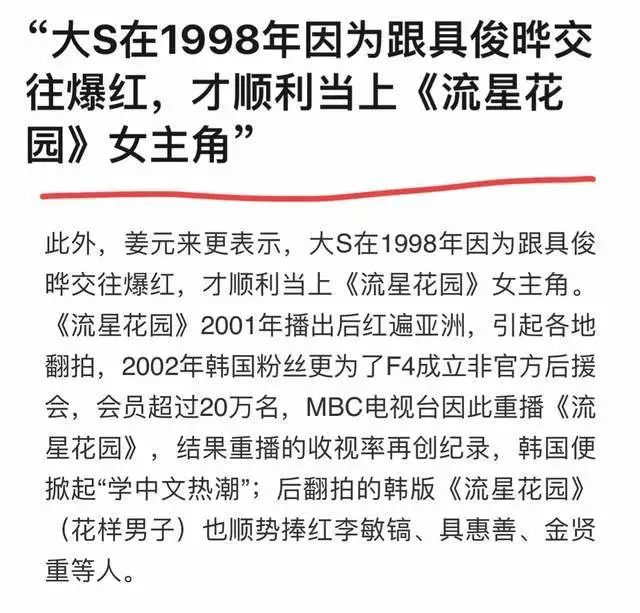 据酷龙组合的另一位成员姜元来介绍,当年大S之所以能顺利出演《流星花园》女主角杉菜,就是因为她和具俊晔的恋情,抬高了自己的知名度。