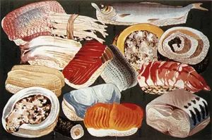 江户时代的常见寿司品种。左上起:小鲷、白鱼、香鱼姿寿司、海松贝、鱚鱼、鳟鱼、小肌、厚烧玉子卷、海苔太卷、车虾、乌贼轮切、海苔细卷、竹荚鱼、赤贝、鲭鱼押寿司。出自《偲ぶ与兵衛の鮓》小泉清三郎/著