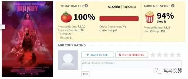 所幸在十年之后的2018年,凯奇大叔又找回了自己的良心。可能是因为钱还的差不多了,这次在圣丹斯电影节上首次亮相的复仇新片《曼蒂》广受好评,口碑大爆!烂番茄指数达到了100%!!凯奇在片中饰演的一位中年大叔(本来就已经是大叔了),因为挚爱被某宗教屠杀,一度精神错乱的他开始复仇,全片一路狂杀,毫无尿点!